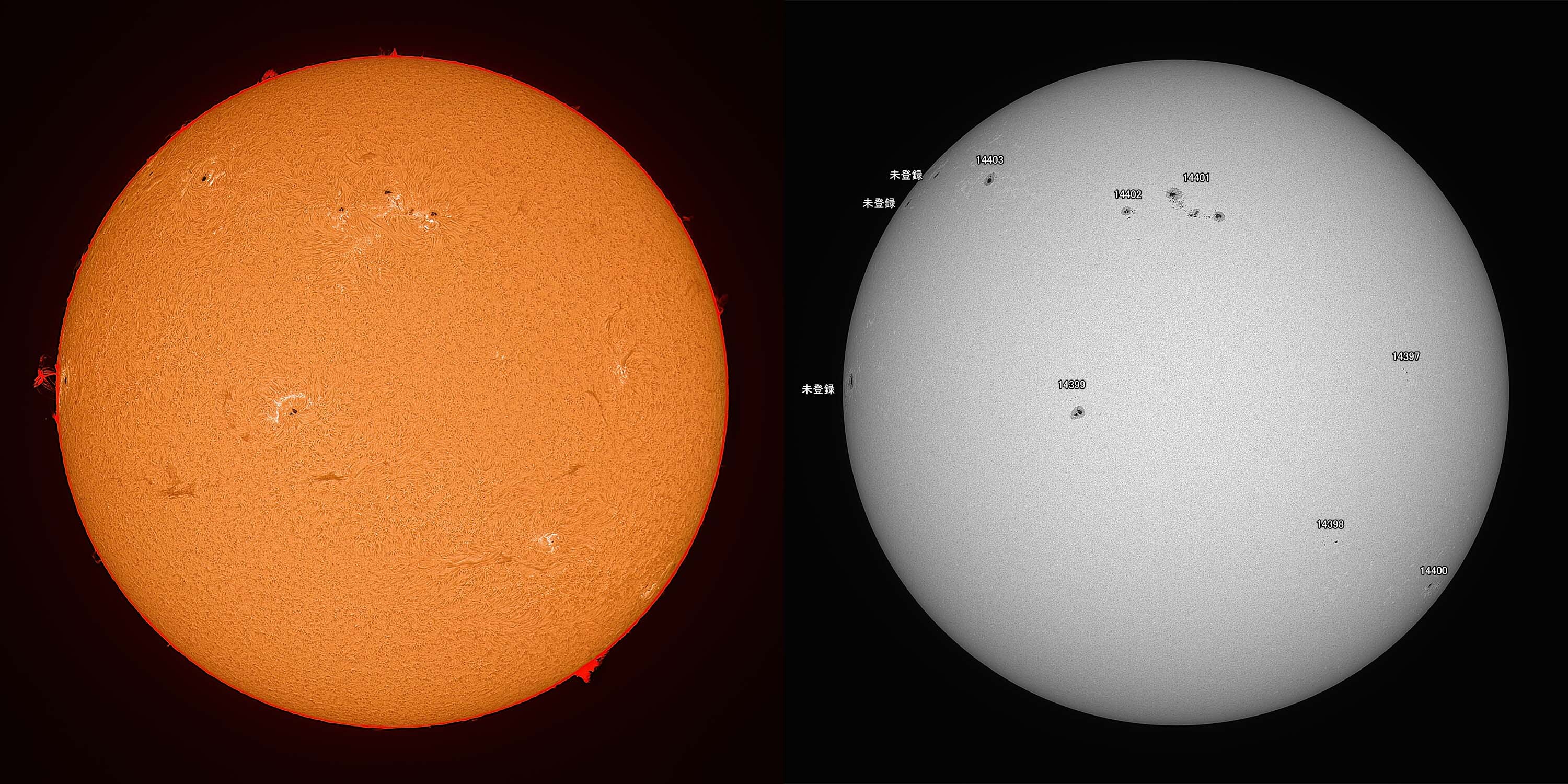 光球面:FireCapture、ROI 3600x2400、Gain 100、2.25msec x1000、撮影時間 31秒/プロミネンス:FireCapture、ROI 3600x2400、Gain 300、2.25msec x1000、撮影時間 31秒