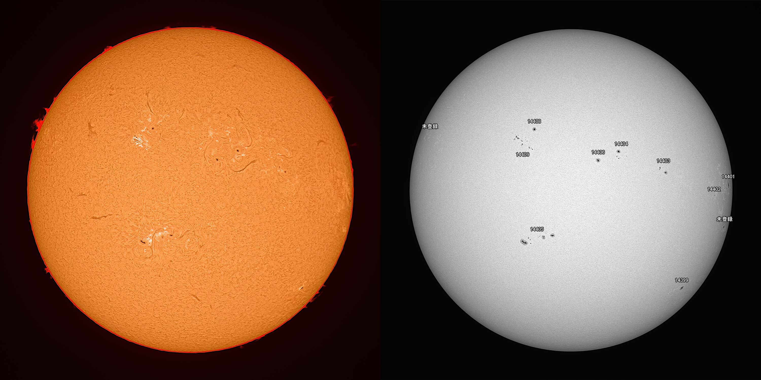 光球面:FireCapture、ROI 3600x2400、Gain 100、1.55msec x1000、撮影時間 31秒/プロミネンス:FireCapture、ROI 3600x2400、Gain 300、1.55msec x1000、撮影時間 31秒