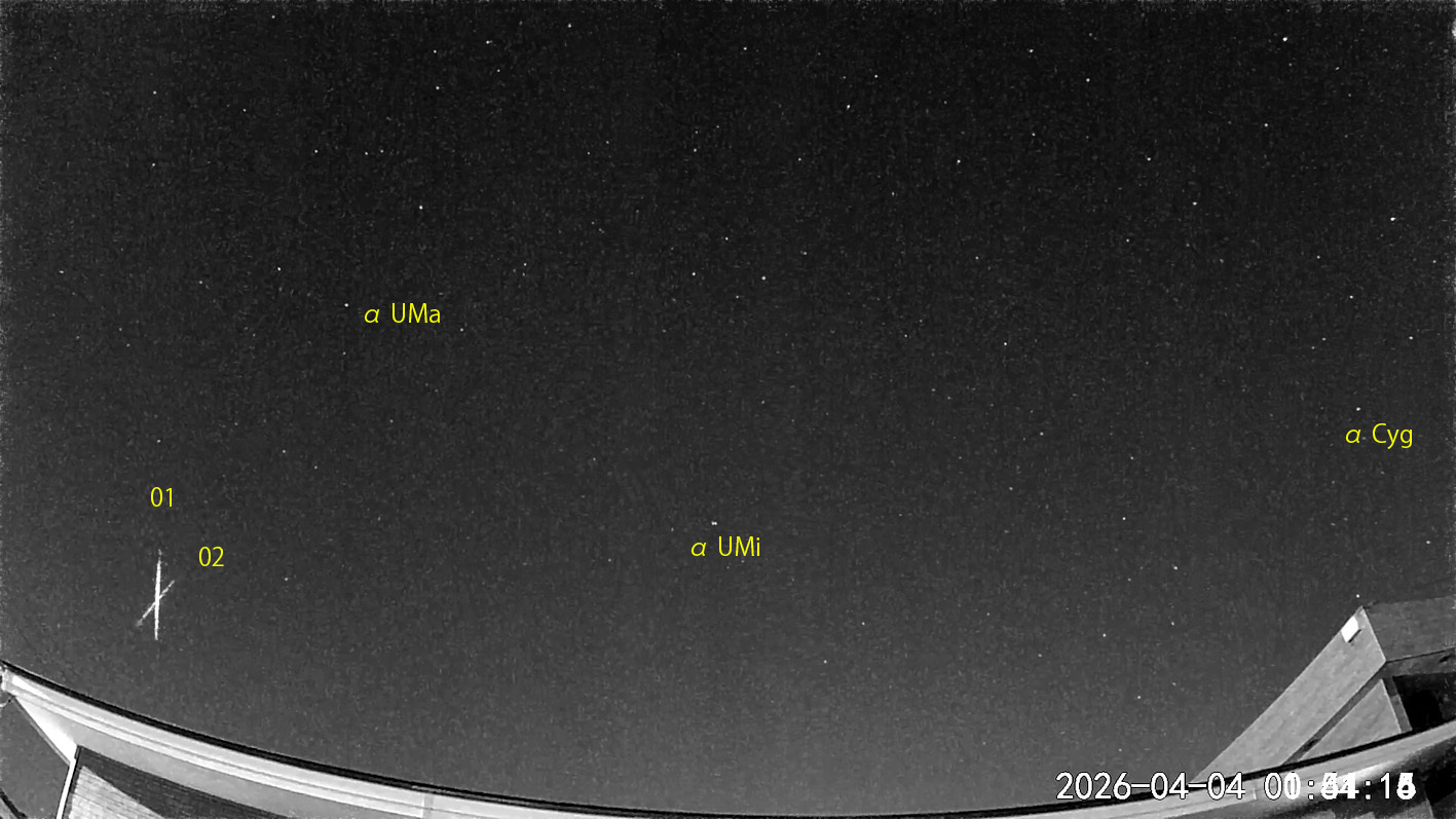00:44から約1時間の2コマを処理しました。一晩中、快晴でした。 出現した順に数字と記号を始点付近に記入。tは痕traceあり。