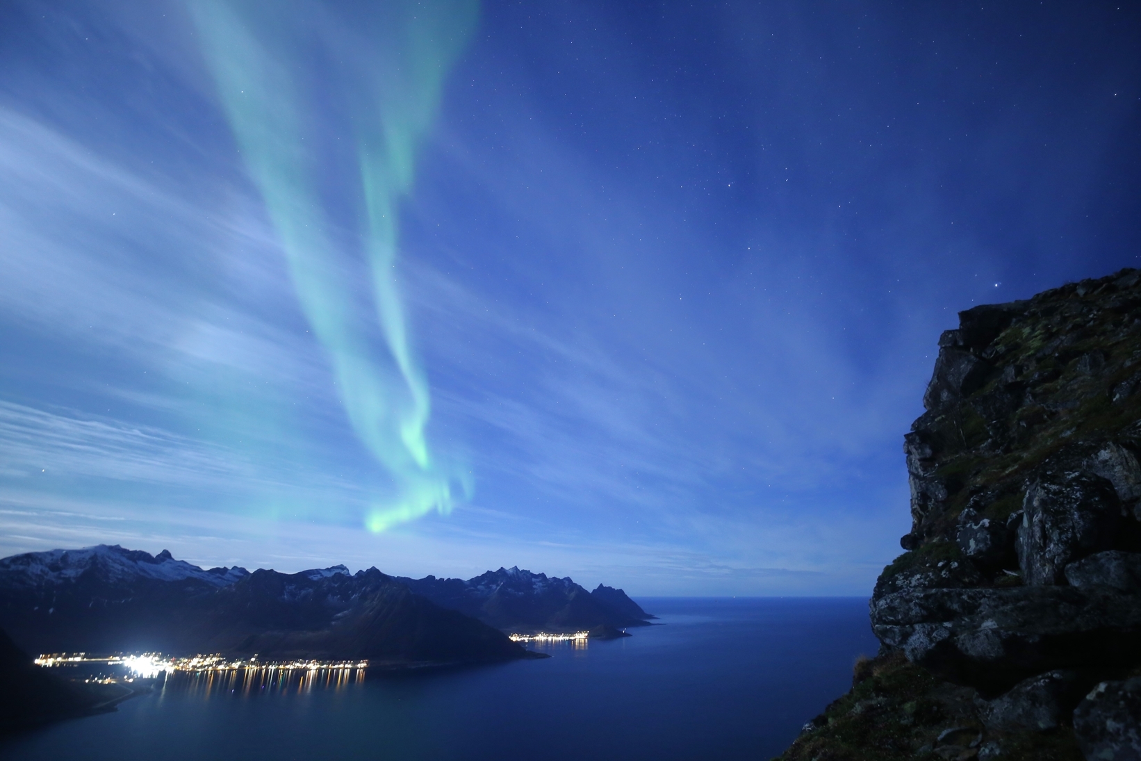 尾根上なので反対側の海も見渡せます。 フィヨルドの先は外洋であるノルウェー海。垂直な断崖が切り立っています。 やはりというか現地では断崖の縁すれすれに立っている写真を見ました。 インスタ受けをねらっているのでしょうが非常に危険な行為です。 万一落下すれば700mの海面ダイブとなってしまいます。 薄雲でわかりづらいですが崖の左にはくちょう座、すぐ上にこと座のベガがあります。