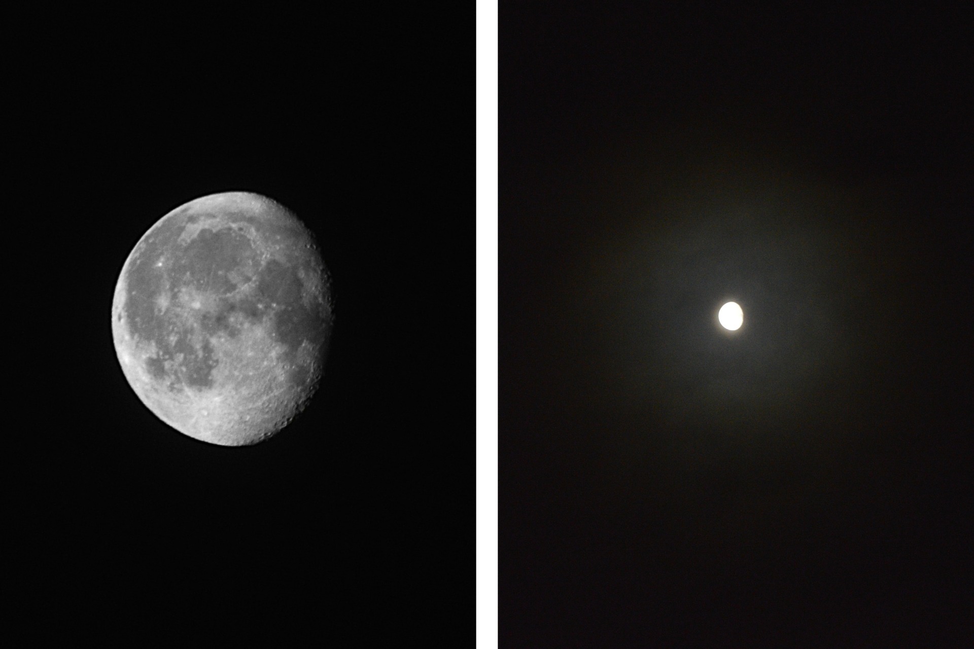 Apollo17から53年ぶりに人間が月に向かっています。 アルテミスⅡのオリオン宇宙船は、日本時間4月7日午前7時ごろ月に最接近するようです。 撮影時点でのオリオン宇宙船の地球からの距離は約35万km(1光秒以上)、月までの距離は約9万kmです。 撮影時点のオリオン宇宙船から見える月の視直径は、地球から見た月の視直径の約4倍です。 月の直径は地球の約4分の1でなので、オリオン宇宙船から見た月の大きさは、月から見た地球の視直径とほぼ同じになっています。 直径3cmの月の画像を用意して、約80㎝離れたところから見ると、撮影時点でのオリオン宇宙船から見た月と同じ視直径で見ることができます。