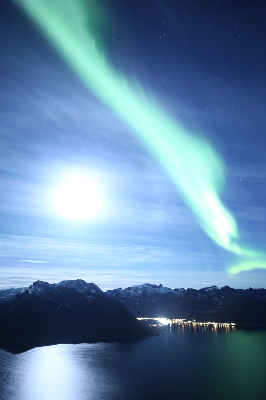 フィヨルドの上空には月と月暈が、そして明るいオーロラが月暈に接しています。 月とオーロラのリフレクションで海面がトリコロール(白、青、緑)となりました。 オーロラが緑でなく赤色で月の白が中央ならば、ノルウェーの海にフランスが出現といったところでしょうか。 またオーロラの明るい部分が月と重なったらどういうリフレクションになるだろうかと、いろいろ想像が膨らみます。