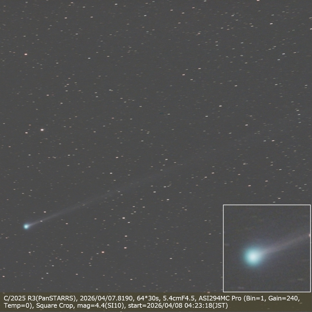 C/2025 R3(PanSTARRS), 2026/04/07.8190, 64*30s, 5.4cmF4.5, ASI294MC Pro (Bin=1, Gain=240, Temp=0), Square Crop, mag=4.4(SI10) 透明度が良い快晴だったので長い尾が写りました https://www.youtube.com/watch?v=RpXlw9WxIog