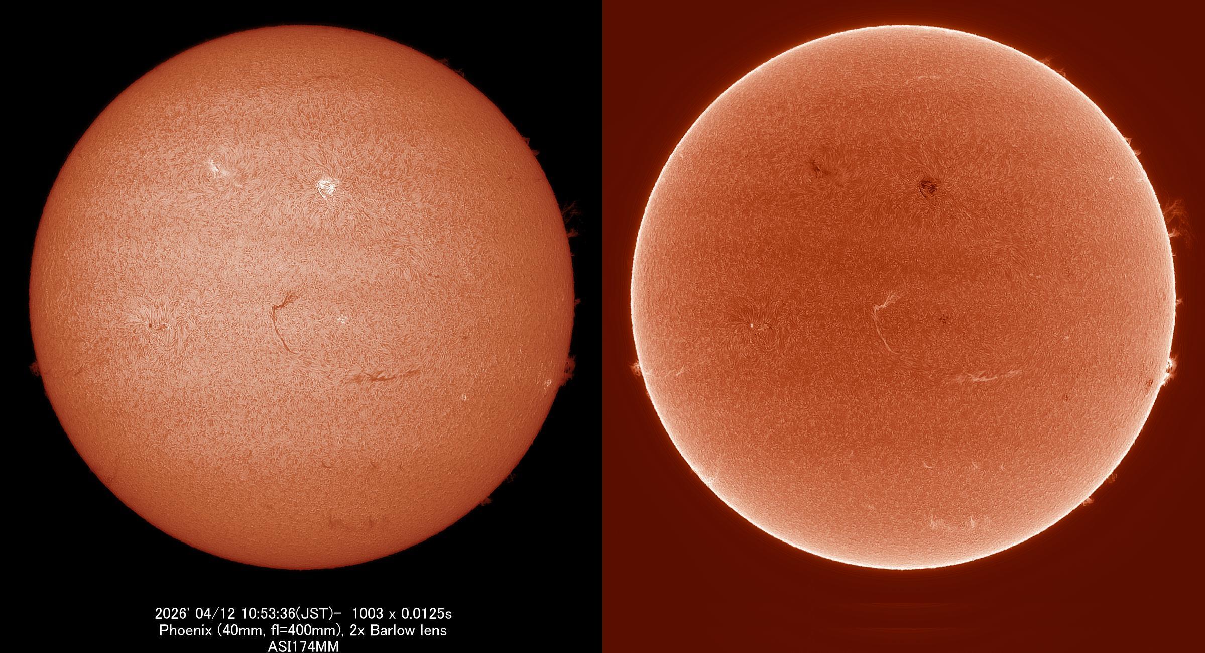機材を、P.S.T.からPhoenixに変更したファーストライトです。 口径は同じ40mmですが、解像度が高く、明るいため露出時間も1/4、ピントやコントラストも合わせやすいです。 光球面の中央から端のプロミネンスまで明るさがフラットなので、反転(厳密には輝度を途中から反転)画像も付けました。