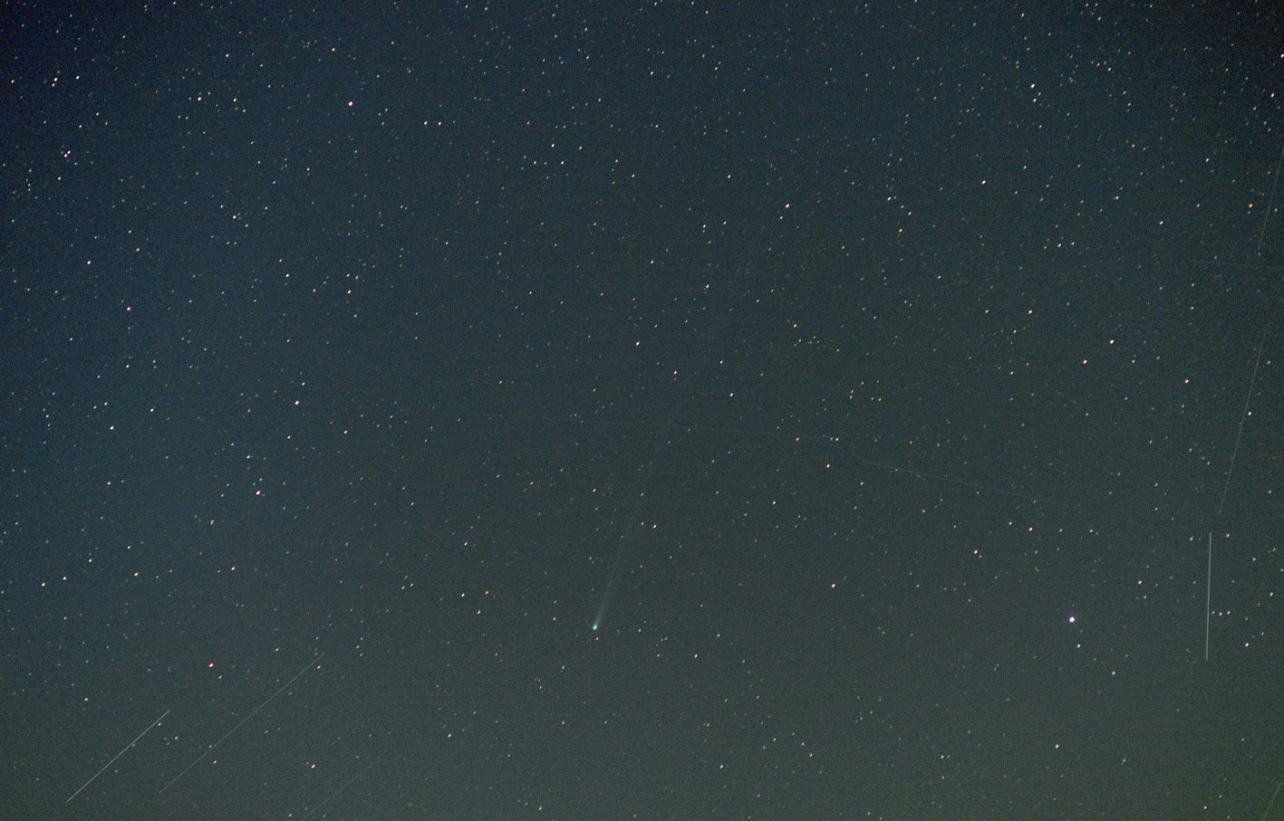 初見です。快晴ながら低空にもやあり、気温0℃。 8x56双眼鏡で恒星状のコマを確認するも尾は確認できず。画像では細く長いイオンテイルが見えています。 投稿画像撮影時には薄明の最中でした。