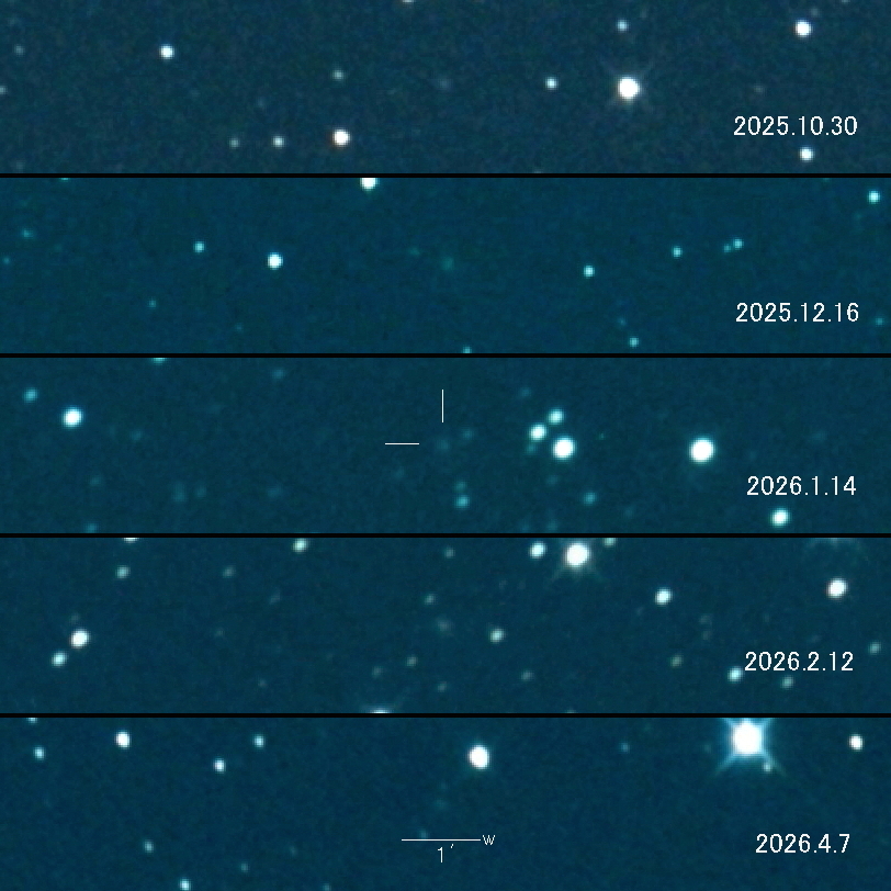 2025.10.30 → 15等級後半 2025.12.16 → 15等級後半 2026.1.14 → 15等級後半 2026.2.12 → 15等級後半 2026.4.7 → 15等級後半 ずっと同じ位の明るさでしたが 4月は少し減光したイメージです。 2025年8月26日が近日点でした。 地球との位置関係で2026年春が明るさのピークという予想です。