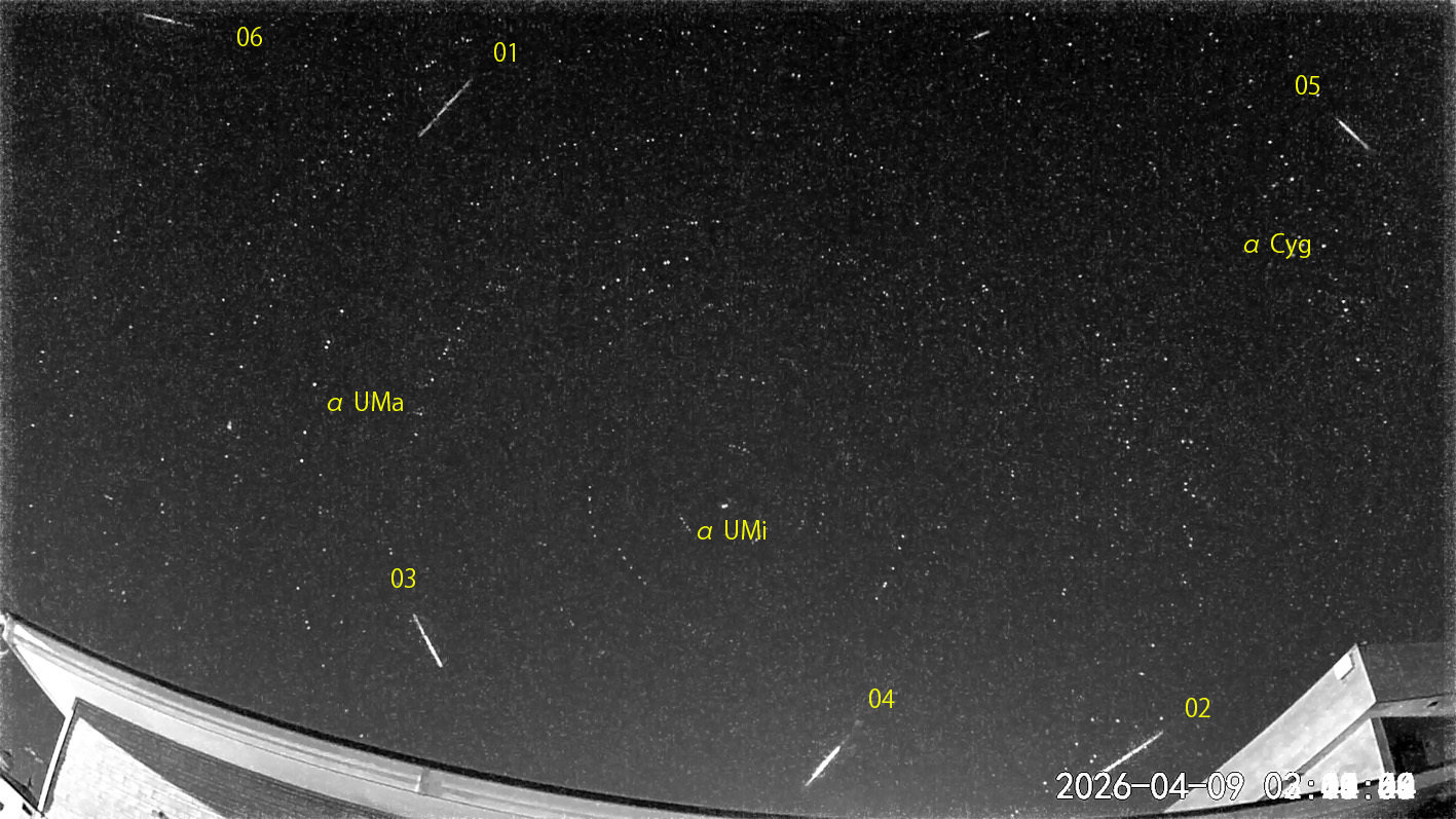 02:01から約2時間の6コマを処理しました。 出現した順に数字と記号を始点付近に記入。tは痕traceあり。 流星が比較的広範囲に出現したため、2枚合成にせず1枚づつ投稿します。