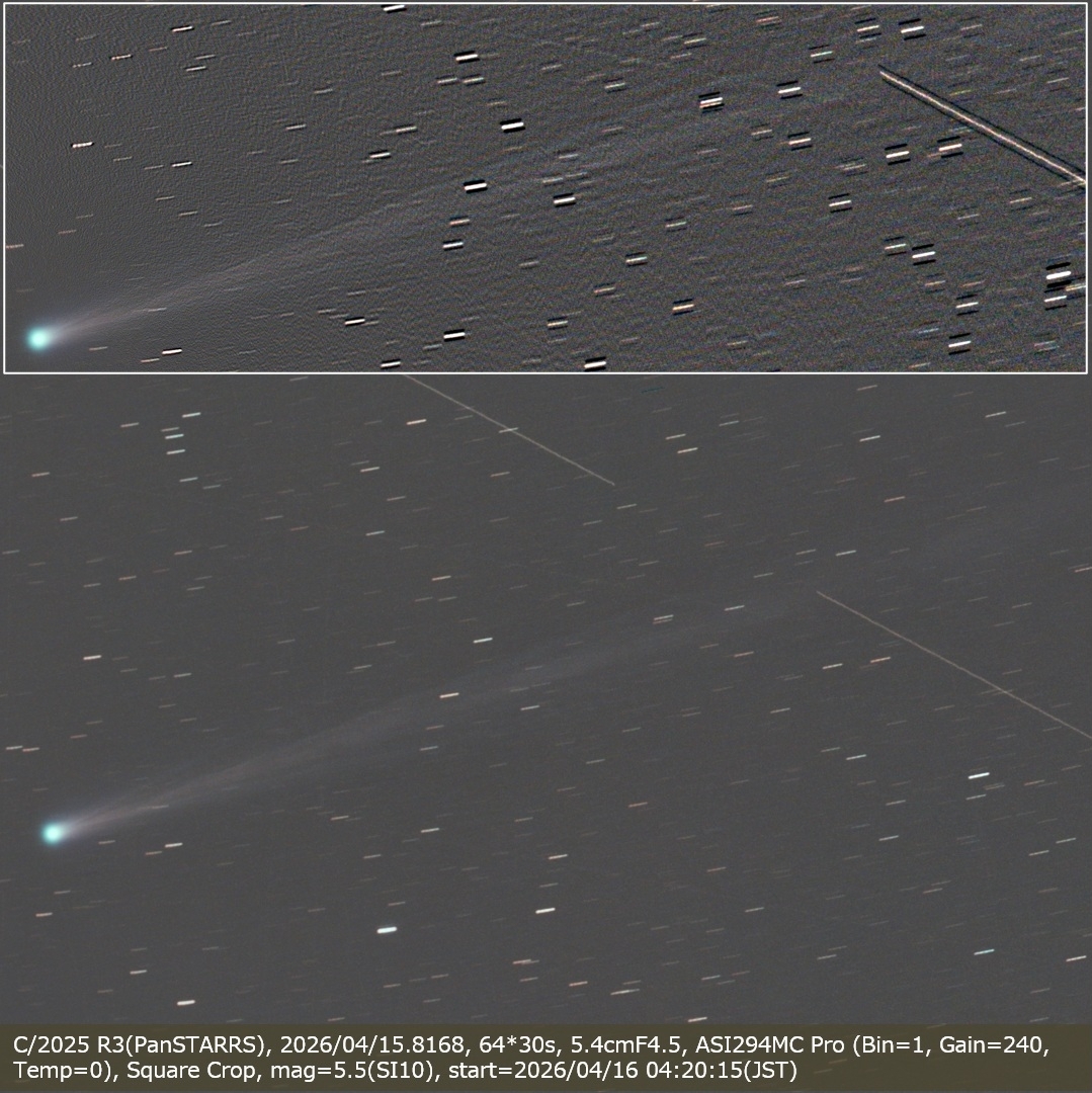 C/2025 R3(PanSTARRS), 2026/04/15.8168, 64*30s, 5.4cmF4.5, ASI294MC Pro (Bin=1, Gain=240, Temp=0), Square Crop, mag=5.5(SI10) やっと晴れてくれました https://www.youtube.com/watch?v=kplY5TBHKX4