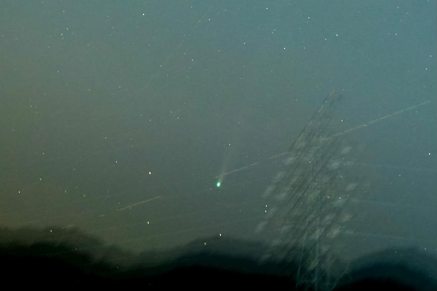旧ポラリエにSONY α7RⅢ+ FE 135mm F1.8 GM セットでインターバル撮影。 isoを8000、f2.2、ss4.0秒で短時間露出。 40コマを通常加算平均コンポジットして、SILKYPIXでピクセル等倍の30%縮小。 この時間の高度は5度ほどで低く、地上の送電線鉄塔が写り込んでしまった。