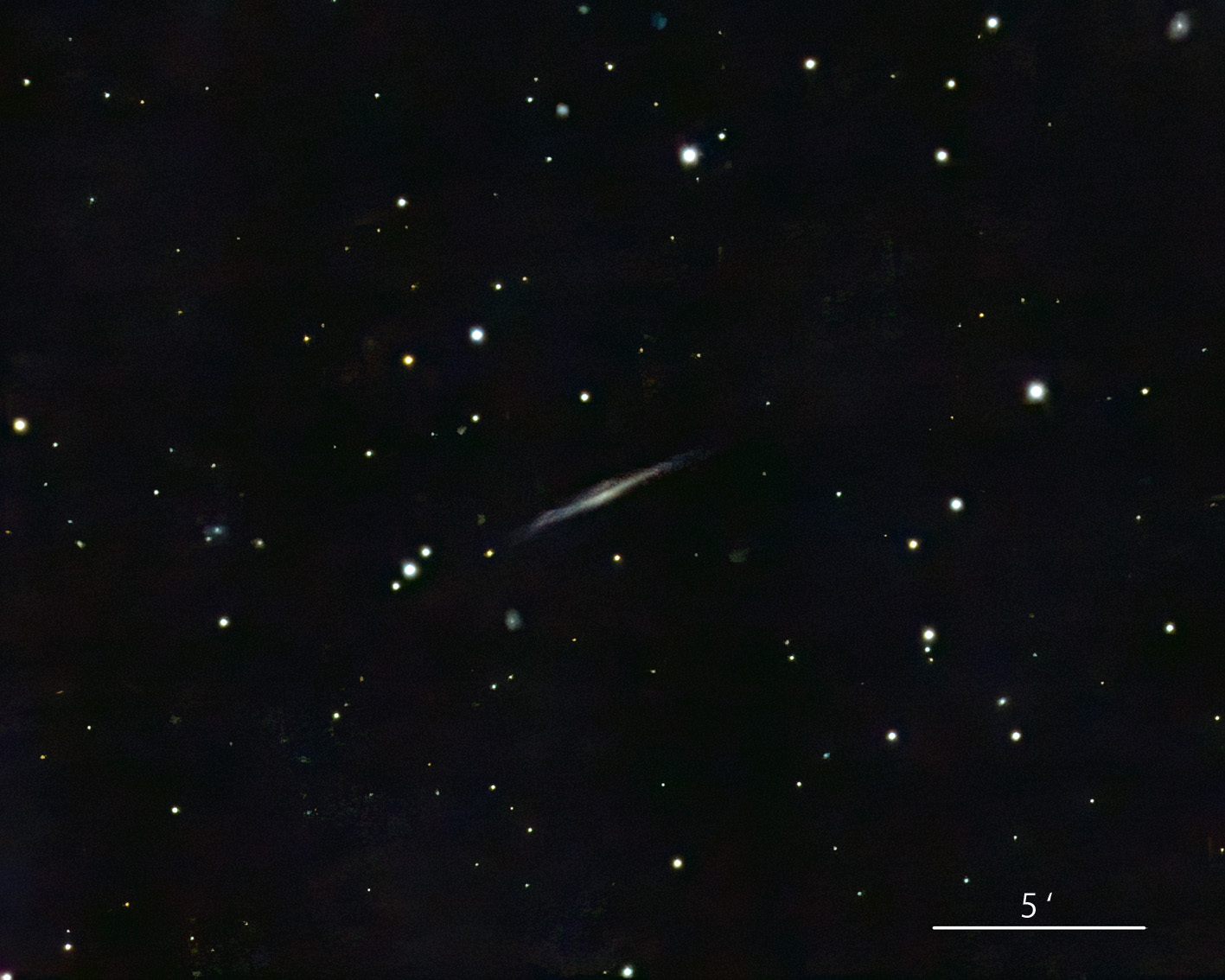 きれいなエッジオン銀河ですが、西側の腕の先はやや歪んでおり、暗めの銀河でした。機材不調で撮影時間が不足してしまいました。