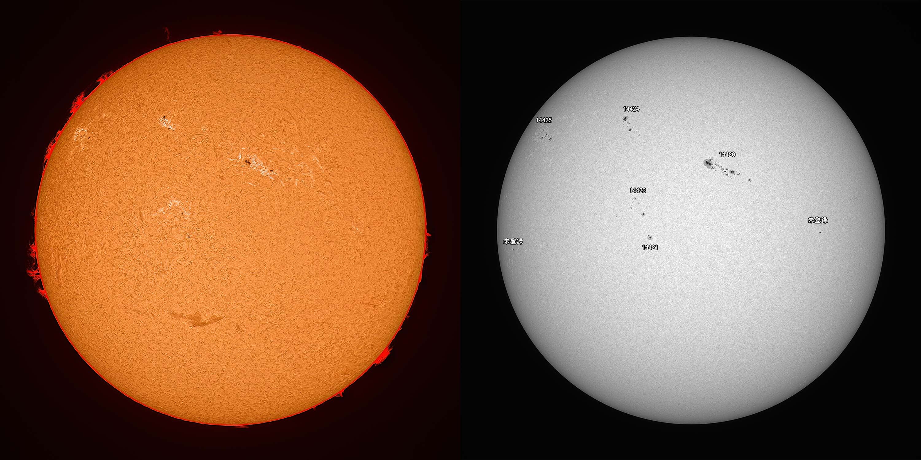 光球面:FireCapture、ROI 3600x2400、Gain 100、1.95msec x1000、撮影時間 31秒/プロミネンス:FireCapture、ROI 3600x2400、Gain 300、1.95msec x1000、撮影時間 31秒