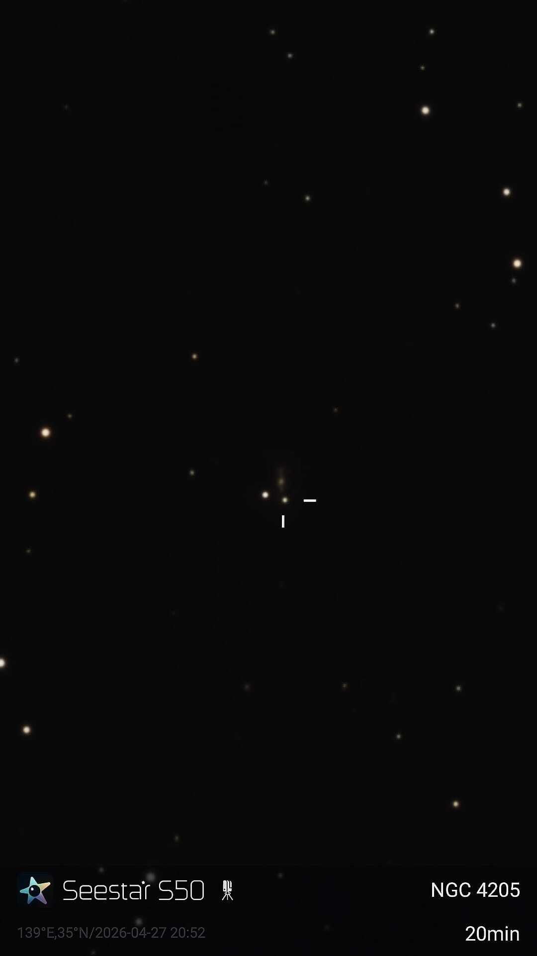 SeestarS50で、NGC4205に現れた超新星2026fvxに挑戦。 りゅう座の方向にある約13.8等の渦巻銀河NGC 4205で、2026年3月に超新星「SN 2026fvx」が発見されました。 この超新星は3月下旬に発見された後、増光して4月初旬に13等級、4月下旬でも13等台後半〜14等級の明るさを維持しており、Seestarでも写りました。