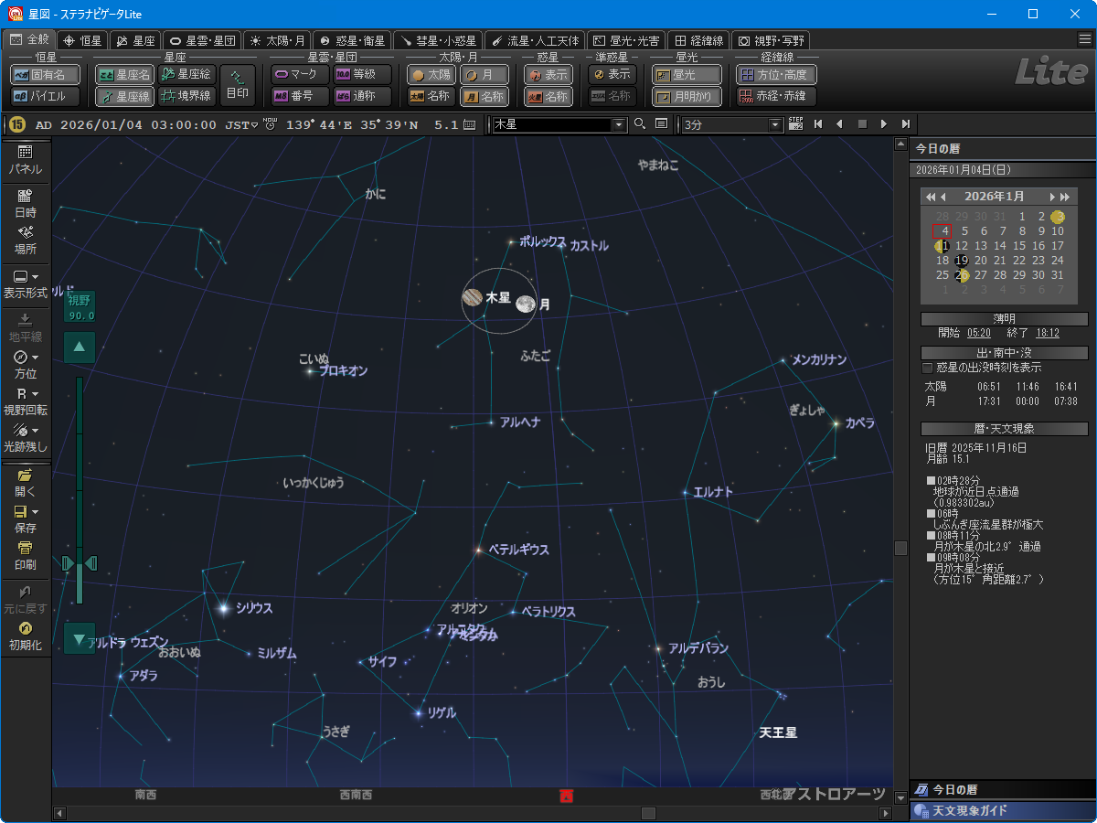 | 1月 3日 | 月(月齢14/15)と接近 | 宵~翌4日明け方 |