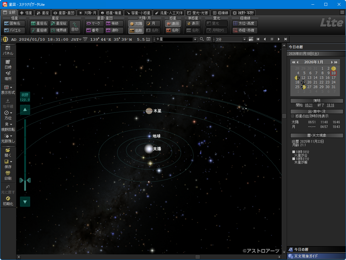 | 1月10日 | 衝(しょう) | 太陽の反対に来る(日の入りのころ昇り、深夜に南に見え、日の出のころ沈む) 日付は赤道座標系(黄道座標系でも10日) |