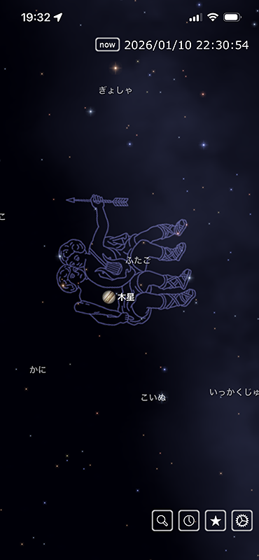 今シーズンの木星は「ふたご座」の領域にあります。11月12日から3月11日までが逆行期間で、この間の1月10日に衝を迎えます。宵空で見やすいのは12~5月ごろでしょう。