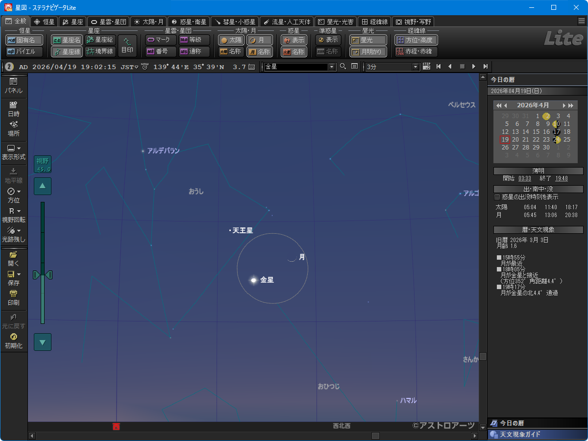 | 4月19日 | 細い月(月齢2)と接近 | 夕方~宵 |