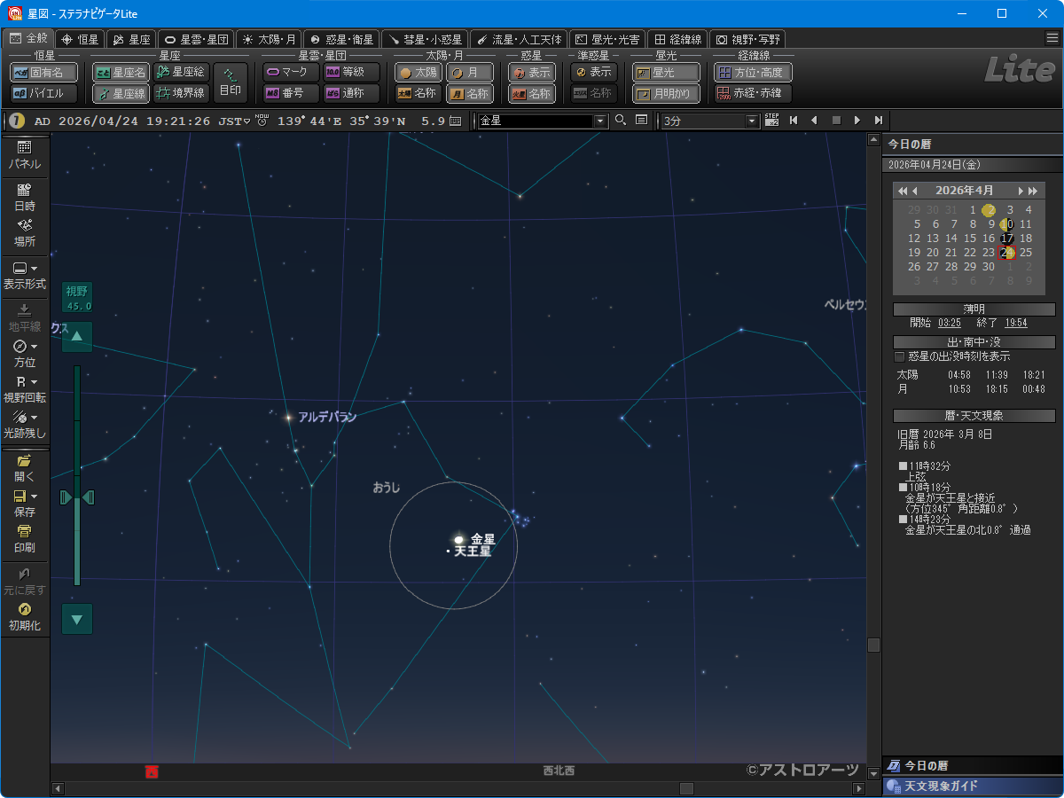 | 4月下旬 | おうし座の散開星団M45プレアデス星団と接近 | 夕方~宵 最接近24日ごろ |
