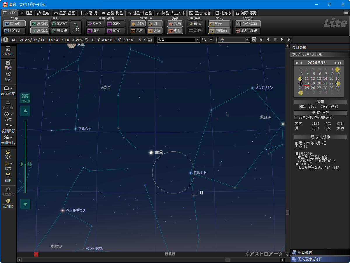 | 5月中旬 | おうし座の2等星エルナトと接近 | 夕方~宵 最接近13日ごろ |
