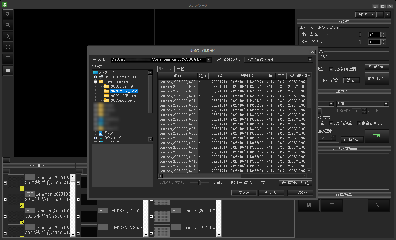「ダーク」(熱ノイズの影響等を除去)や「フラット」(周辺減光の影響等を除去)も使用すると、画像の質がさらに良くなります。