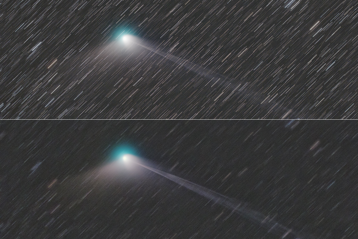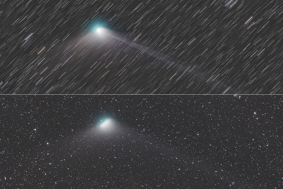 メトカーフコンポジット/恒星基準コンポジット 2023年1月のズィーティーエフ彗星(C/2022 E3)。メトカーフコンポジット(上)と恒星基準コンポジット(下)。恒星基準では頭部が線状に伸び、尾がほとんど見えなくなっているが、メトカーフコンポジットでは頭部が止まり、尾の構造が見える(280mm F3.9、ISO 3200、120秒×31枚/撮影:谷川正夫)。
